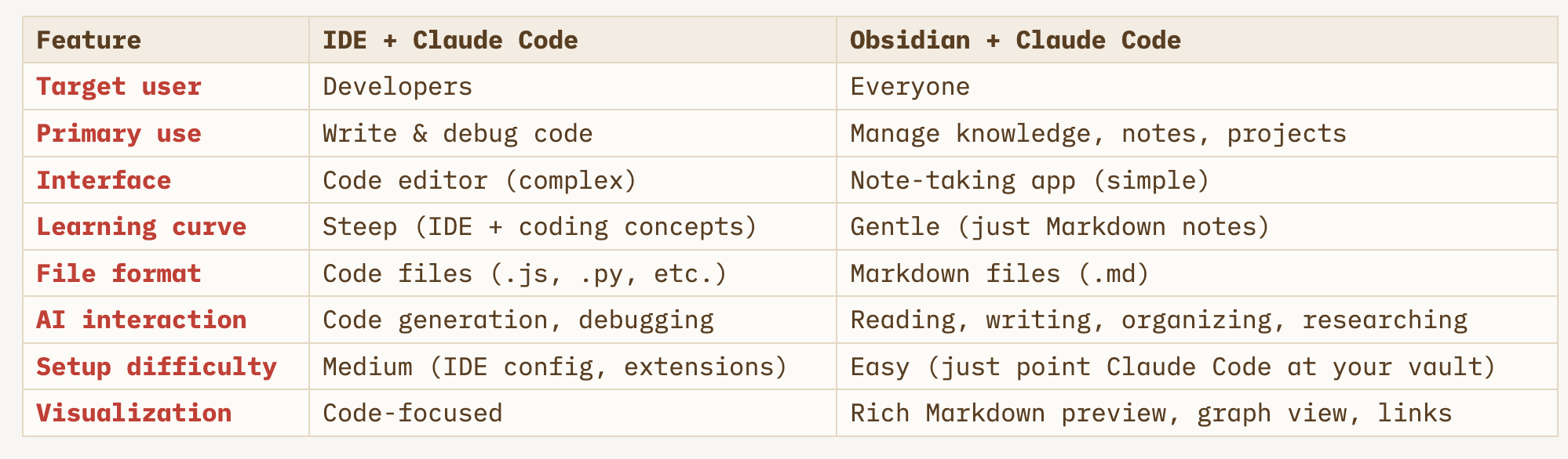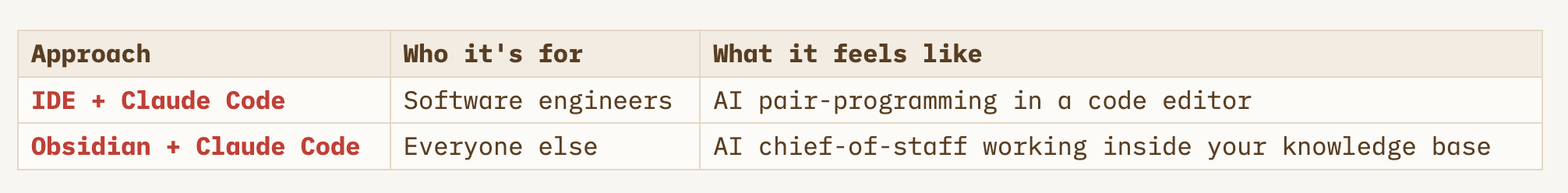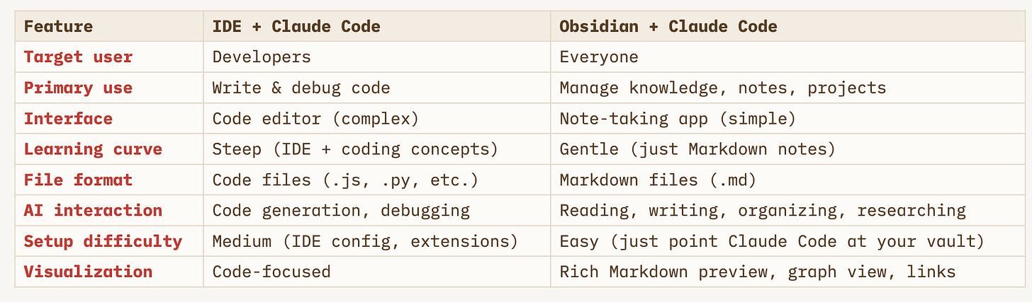 Claude Code is just an AI agent that works with files. It doesn’t care whether those files are code or notes. The IDE is just one way to interact with it — a way designed for programmers.