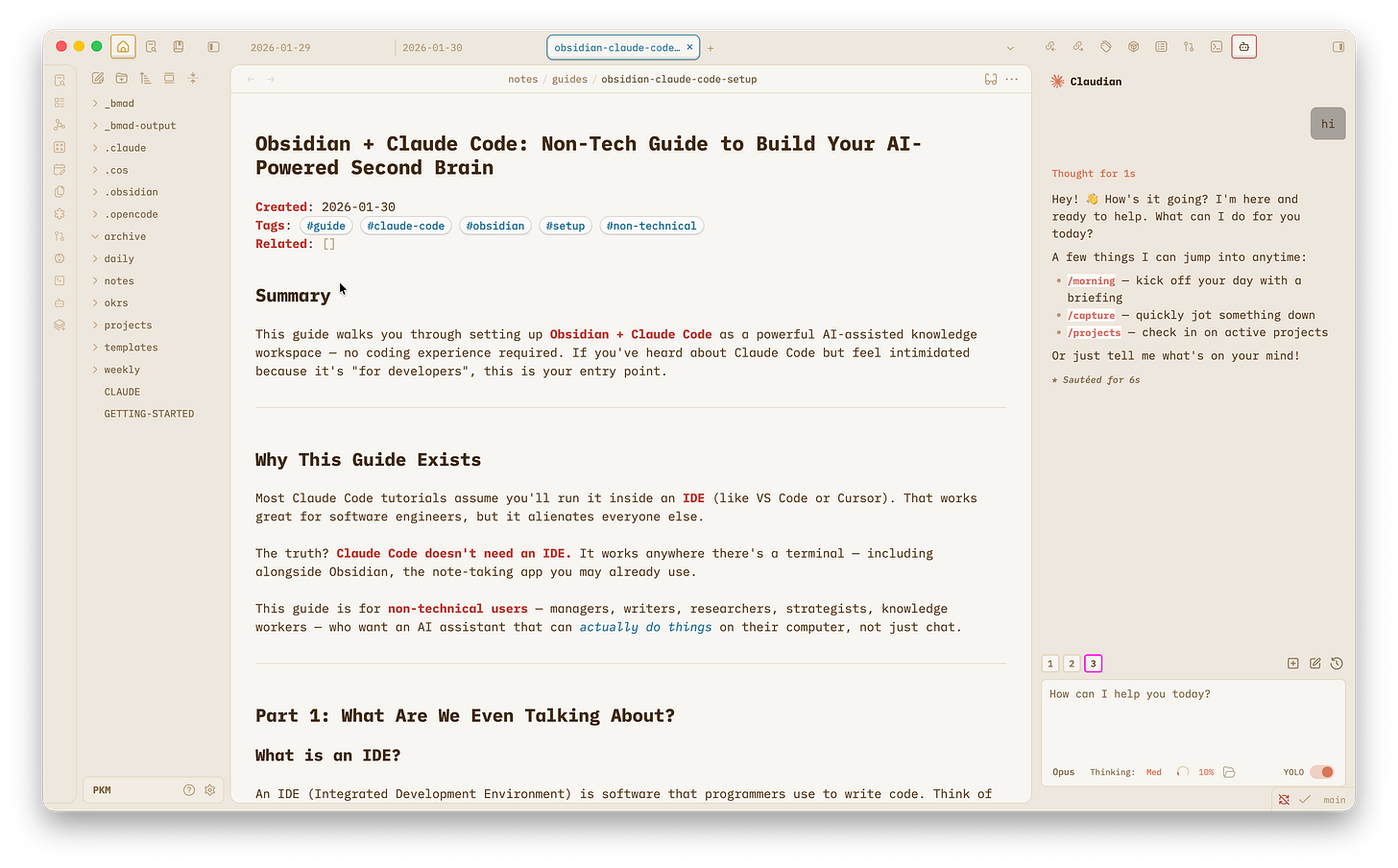 Obsidian + Claude Code gives you a beautiful, familiar workspace (Obsidian) where your AI assistant (Claude Code) can read your notes, create new ones, organize your thinking, research topics, draft communications, and manage projects — all without you ever touching a code editor.